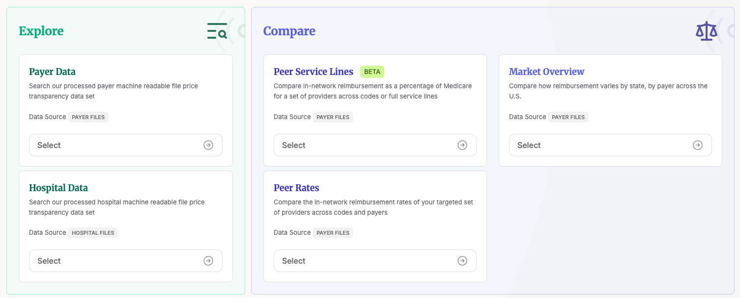 When you enter Signal, you will see 5 modes for exploring price transparency data: