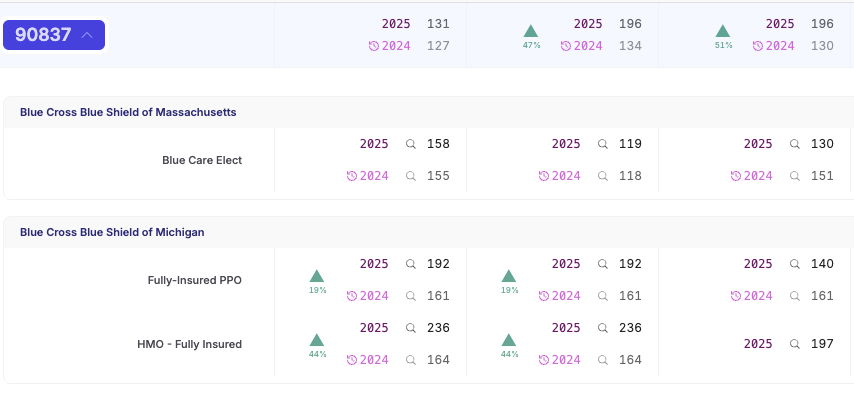 • For each payer and code, Peer Rates will aggregate across all the relevant 'EIN' entries in the provider group. For example, let's say your provider group has 2 EINs: '871927518', '841856765' and you search 90837 in Cigna: