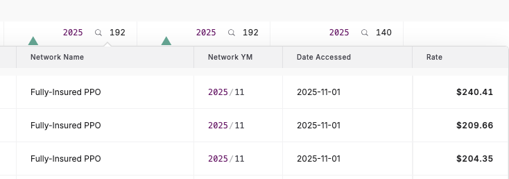 The report enables quick side-by-side comparison of contracted rates amongst peers and automatic updating month-over-month to see how providers' contracts evolve (e.g., new networks they appear in, rate adjustments on existing contracts, etc.).