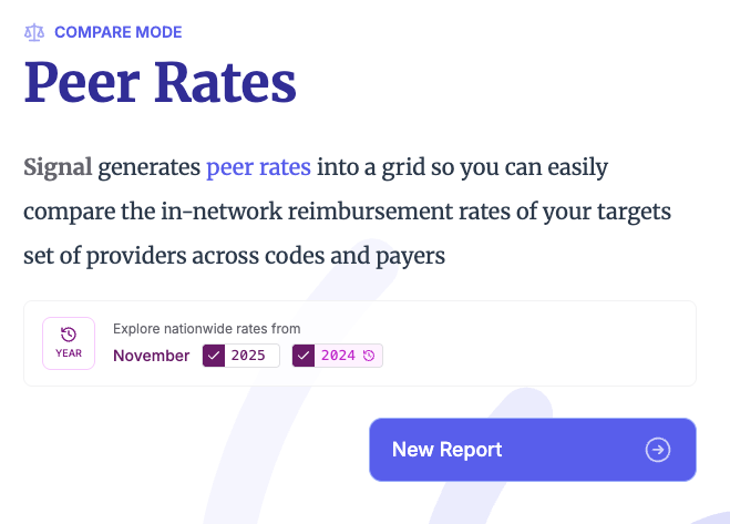 As you most likely already know, our Signal platform is updated monthly with the latest price transparency data posted by payers. Until now, there was no way to look up historical rates to see rate increases/decreases and overall market trends. But with the addition of historical data to your Signal platform subscription, you now have full access to the previous year’s price transparency dataset - integrated directly into your platform - to allow you to gain additional insights.