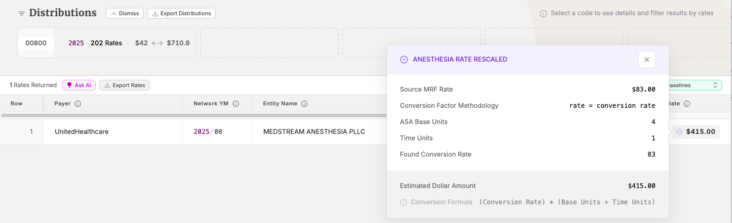 By identifying which portion of the anesthesia formula each payer reports and accounting for variations in time unit calculations, rounding rules, and conversion factors, we’ve unlocked true apples-to-apples comparisons with coverage rates up to 89%. Within the Signal platform, users will see a purple check mark next to any translated rate, along with clear methodology notes that explain how the final fee was derived. This unlocks unprecedented clarity for benchmarking, contract strategy, and competitive intelligence in one of the most opaque areas of healthcare pricing.