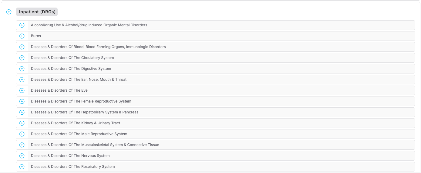As a note on Service Categories — this is a new feature that the Serif Health team has developed by grouping codes together based on usage in the real world. Our Service Categories are also separated into subcategories, and each level can be selected when building a report. For example, the "Inpatient (DRGs)" category can be selected to roll-up rates across all DRGs, or a subcategory can be selected if you are interested in specific DRG codes (e.g., Burns). Feel free to reach out to support@serifhealth.com if you have any questions around our categories and subcategories!