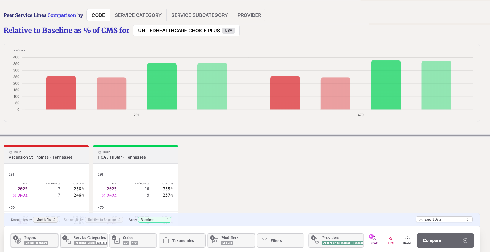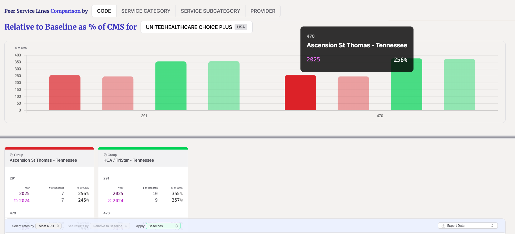 With Peer Service Lines - you can now summarize reimbursement rates relative to a baseline (e.g., percent of Medicare) and rollup across codes and service lines so you can easily compare a target set of providers.